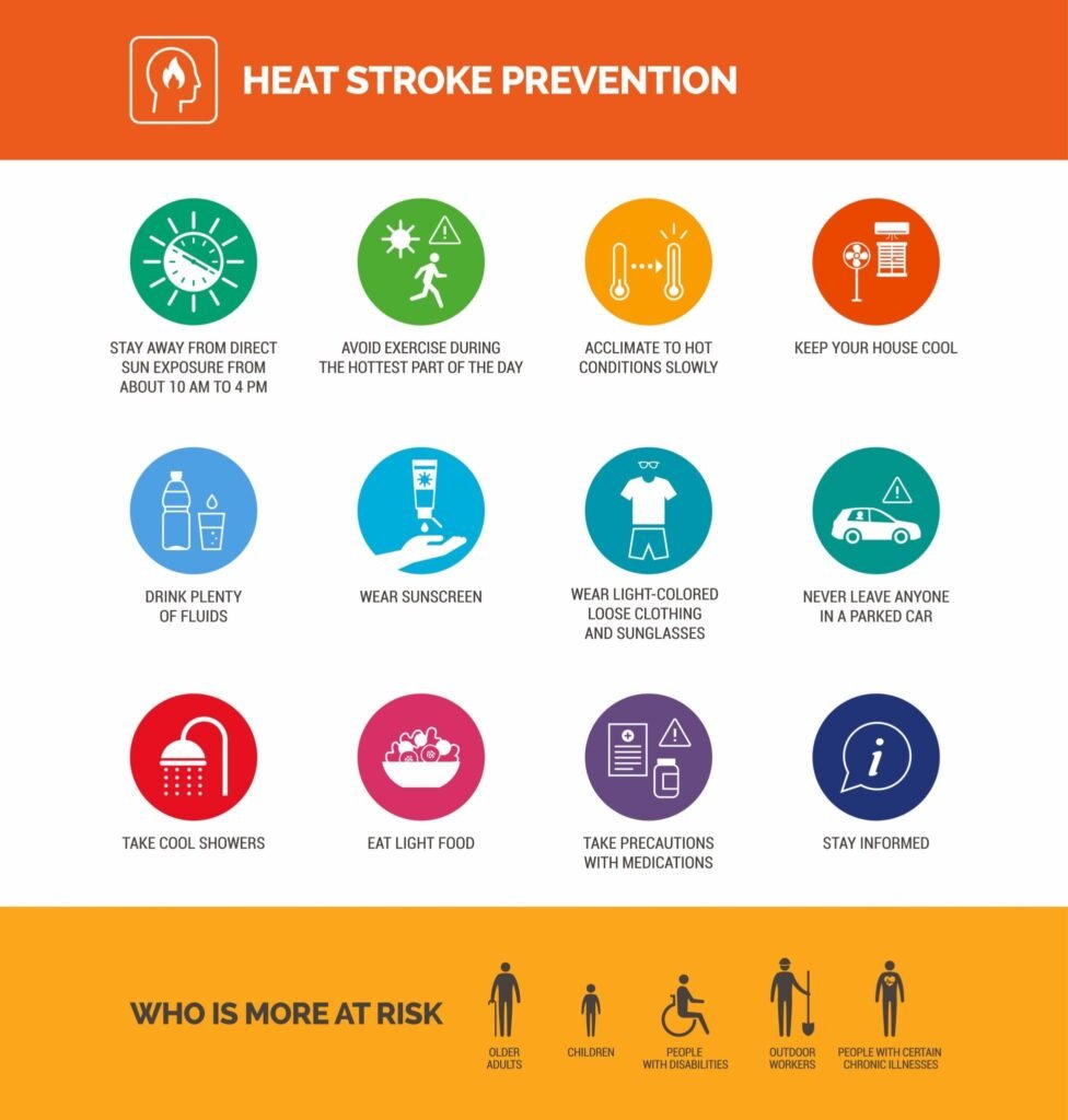 Heat stroke and heat exhaustion prevention during extreme hot weather, icons set